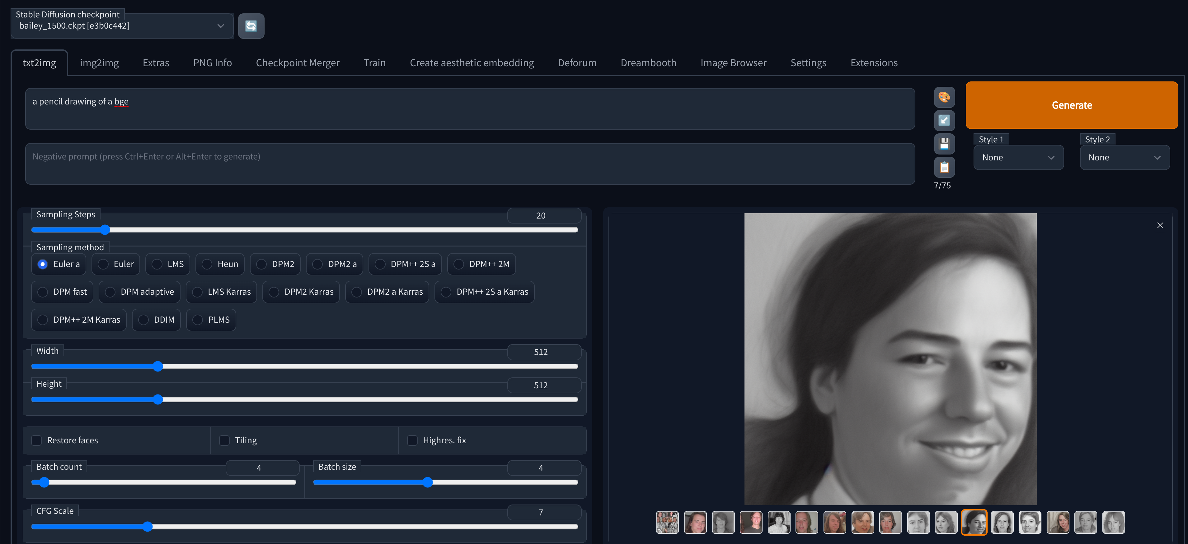 Trying your model out: After training is completed you can go back to the txt2img tab and try it out, if you dont see your model available you may need to click the refresh icon next to the checkpoint dropdown.